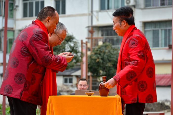 仪式在拥有百年窖池的重庆百年诗仙酒业有限公司生产车间举行,在弥漫着岁月醇香的车间里,身着传统服饰的传承人向企业技术骨干行敬酒礼,随后传授窖泥养护技艺。